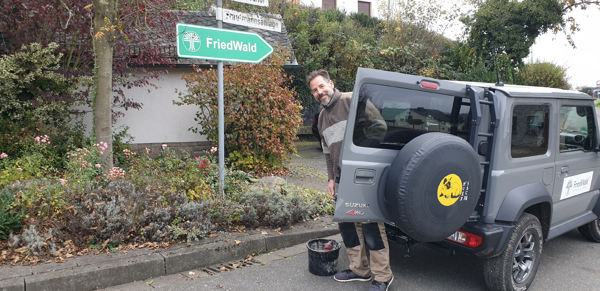 Die angebrachten FriedWald-Wegweiser der Vergangenheit erwiesen sich manchmal zu klein und wurden häufig übersehen. Um Abhilfe zu schaffen montierten die beiden FriedWald-Förster Attenhausens, Frank Liehman und Peter Lohré, deutlich großformatigere Hinweisschilder, zudem auch noch in einem kräftigen Grünton angemessen des Forstes oberhalb der Ortschaft. Bürgermeister udo Ludwig überwachte die Aktion und legte Hand an den Zollstock.