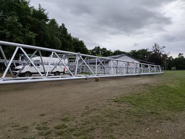 Am 06.06.25 wurde der Mast von einem großen Fahrzeugkran in seine Position gehoben, nachdem die Monteure an den beiden Tagen vorher die Konstruktion zusammengeschraubt hatten. 25 große Stahlplatten bildeten den sicheren Untergrund für den Kran und schützten gleichzeitig den Boden des TuS-Parkplatzes.