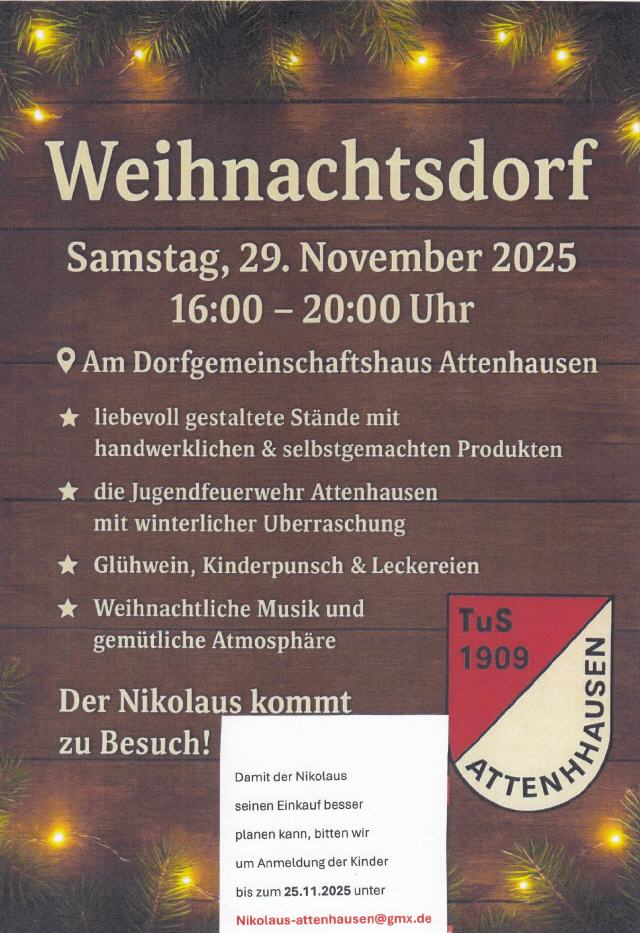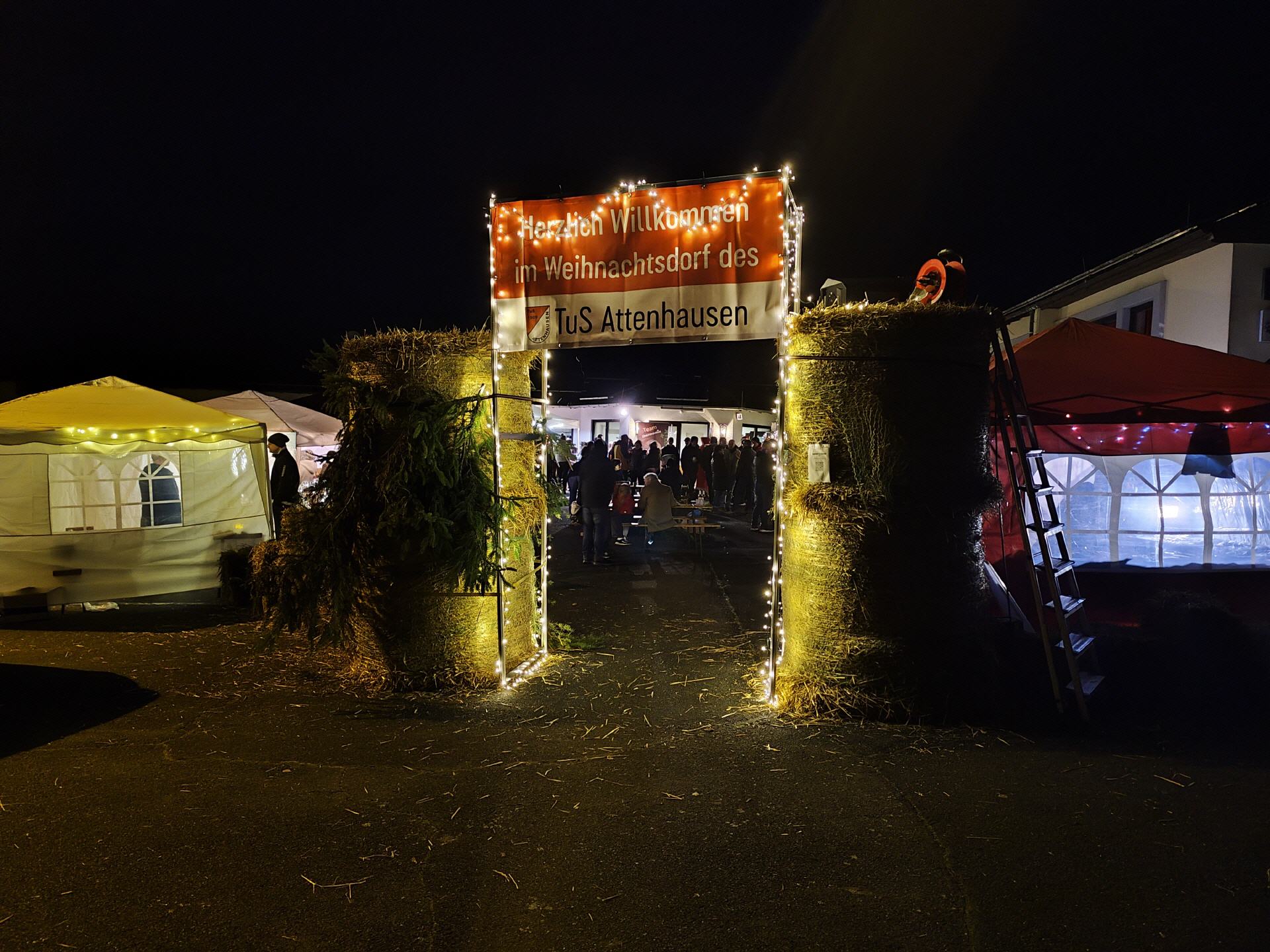 Gemütlich ging's zu beim Weihnachtsdorf des TuS am Dorfgemeinschaftshaus in Attenhausen. Liebevoll war der Eingang zum Dorf dekoriert worden und lud zu einem Rundgang durch die Weihnachts-Stände ein. Eine Feuertonne verbreitete Wärme und ein schönes Licht, viele Besucher mit kleinen Kindern waren zu sehen. Ein Cateringzelt der Obermühle sorgte für den gefüllten Magen, weihnachtliches war in den einzelnen Ständen zu bestaunen.